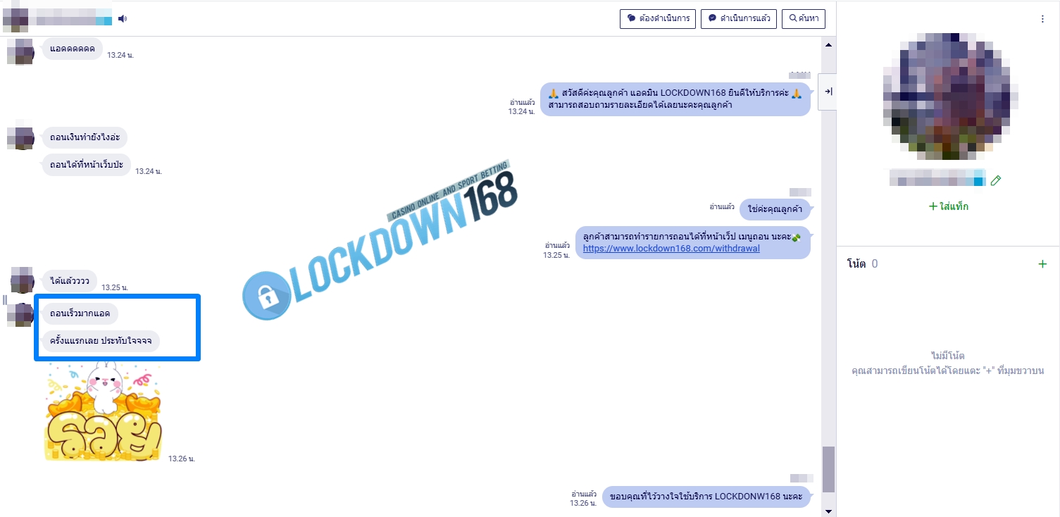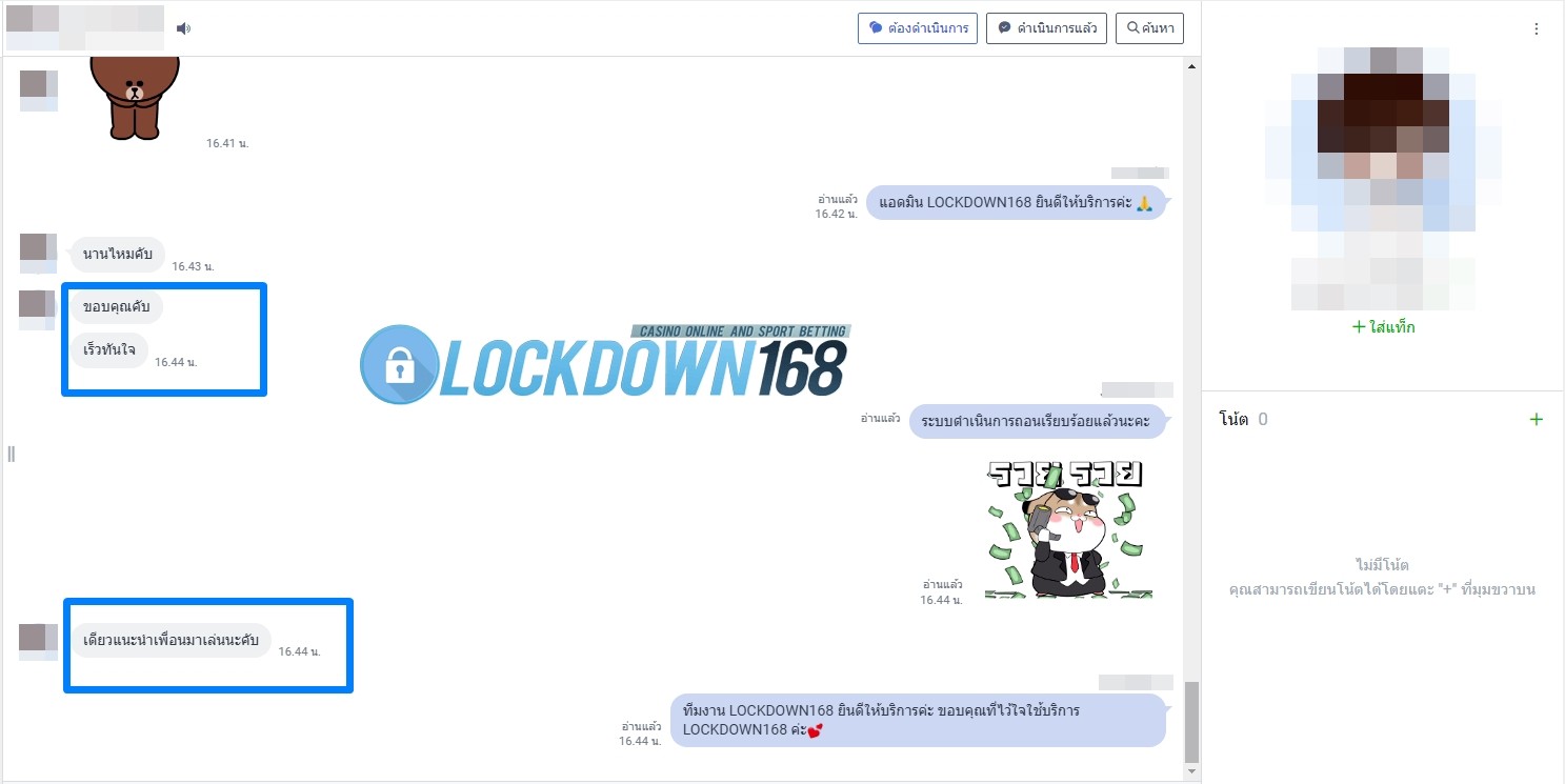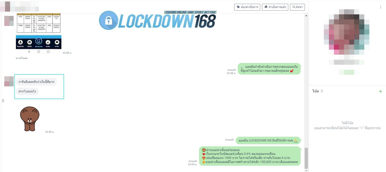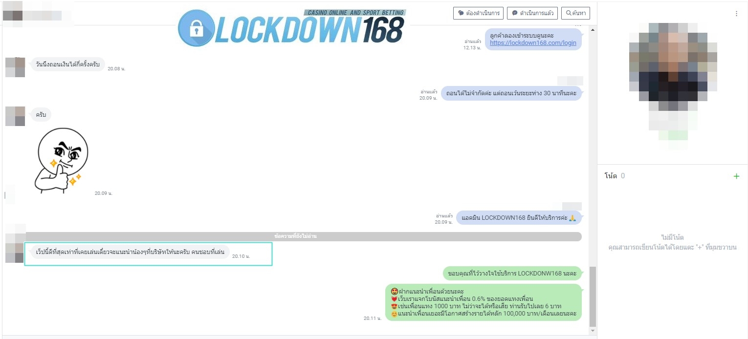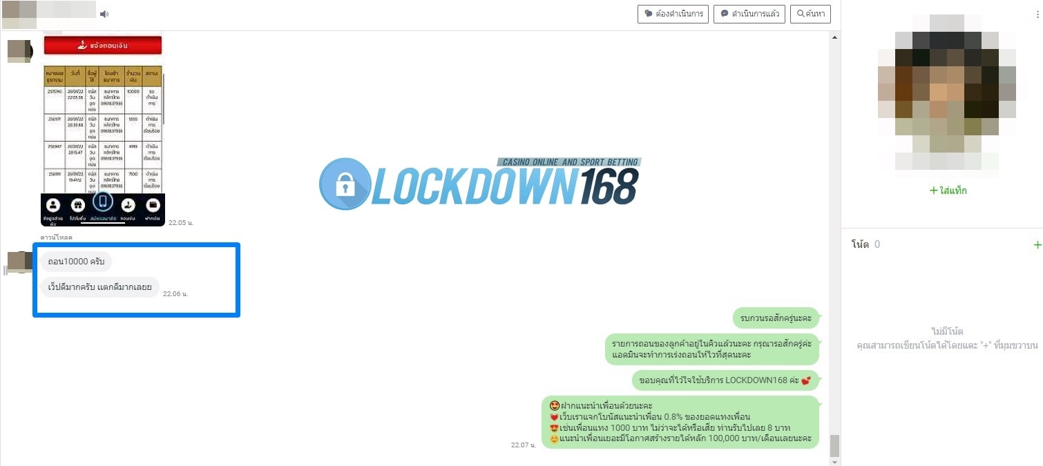 LOCKDOWN168.COM คาสิโนออนไลน์น้องใหม่ที่มาแรงที่สุดในตอนนี้ ด้วยระบบฝาก-ถอนอัตโนมัติ ที่ใช้เทคโนโลยีการจับยอดแบบใหม่ จับยอดฝากได้ภายใน 10 วินาที สามารถเล่นได้ทันทีหลังทำการโอนเงิน และระบบถอนเงินที่สามารถถอนเงินที่หน้าเว็ปได้ด้วยตัวท่านเอง โดยไม่ต้องแจ้งแอดมินและยอดเงินจะเข้าหลังจากทำการถอนภายใน 5 นาที เว็ปของเราคำนึงถึงความสะดวกสบายของลูกค้าเป็นหลัก หากลูกค้าพบปัญหาใดๆก็จะมีเจ้าหน้าที่แอดมินค่อยดูแลอำนวยความสะดวกให้คุณลูกค้าตลอด 24 ชั่วโมง
