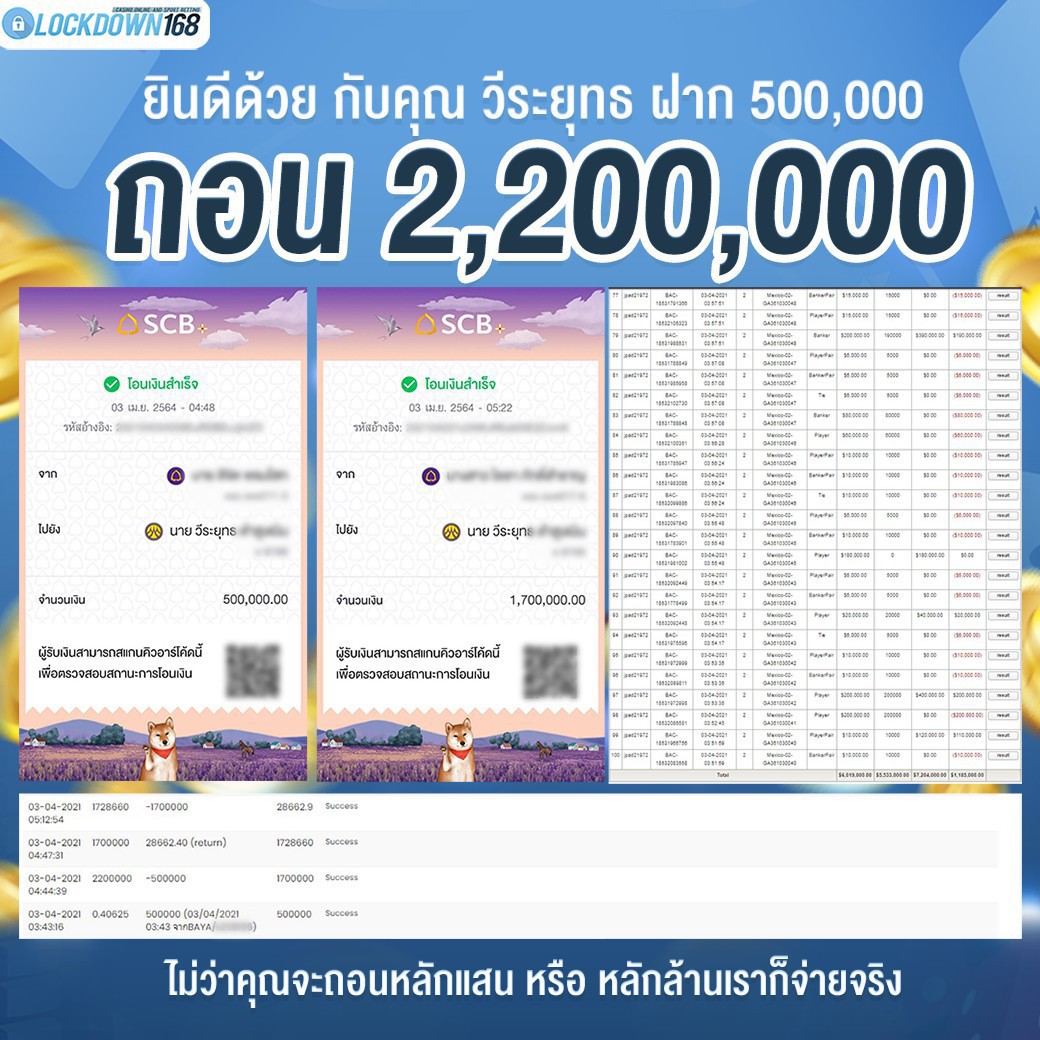 การันตีความมั่นคงของเว็บไซต์เรา เล่นได้มากแค่ไหนเราก็จ่ายไหว เป็นเศรษฐีไม่จำเป็นต้องลงทุนเยอะ เปลี่ยนเงินร้อยเป็นเงินล้านคุณก็ทำได้ !!! กี่ล้านก็จ่าย ไม่ว่าจะฝากหลักร้อยถอนหลักแสน หรือ หลัก1,000,000 (ล้าน) ไม่จำกัดจำนวนการถอนต่อวัน ถอน 300 หรือ 10,000,000 บาท เราก็จ่าย ด้วยระบบถอนเงินที่สามารถถอนเงินที่หน้าเว็ปได้ด้วยตัวท่านเอง โดยไม่ต้องแจ้งแอดมินและยอดเงินจะเข้าหลังจากทำการถอนภายใน 5 นาที LOCKDOWN168