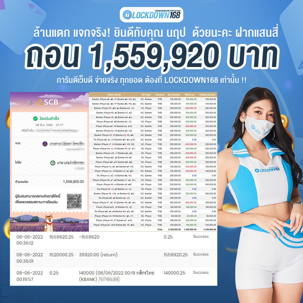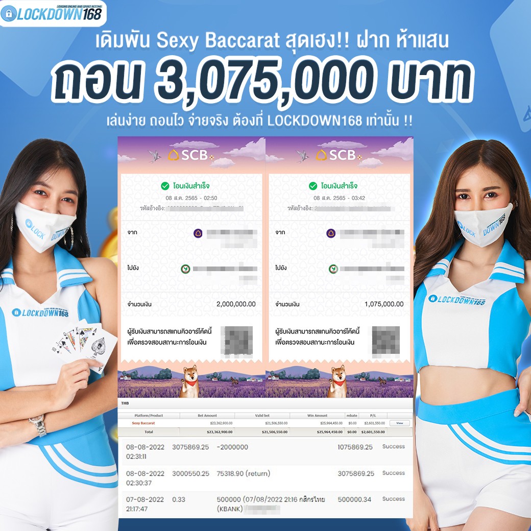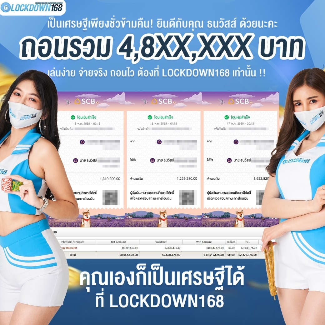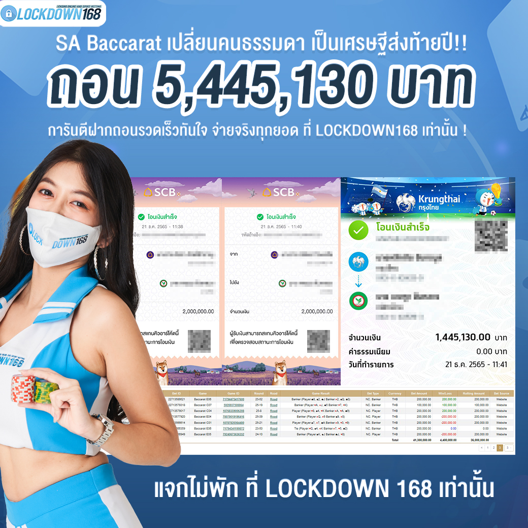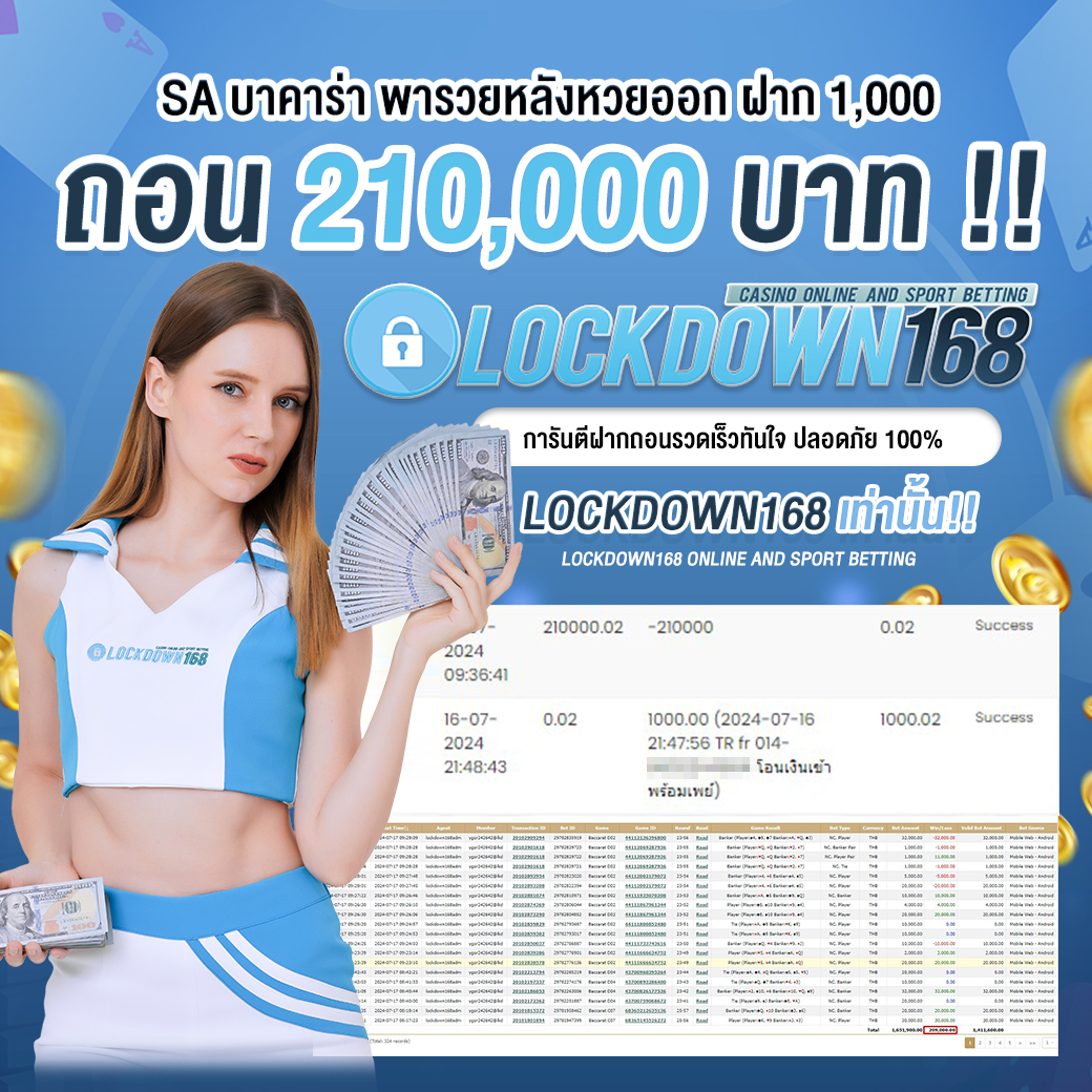 LOCKDOWN168.COM คาสิโนออนไลน์น้องใหม่ที่มาแรงที่สุดในตอนนี้ ด้วยระบบฝาก-ถอนอัตโนมัติ ที่ใช้เทคโนโลยีการจับยอดแบบใหม่ จับยอดฝากได้ภายใน 10 วินาที สามารถเล่นได้ทันทีหลังทำการโอนเงิน และระบบถอนเงินที่สามารถถอนเงินที่หน้าเว็ปได้ด้วยตัวท่านเอง โดยไม่ต้องแจ้งแอดมินและยอดเงินจะเข้าหลังจากทำการถอนภายใน 5 นาที เว็ปของเราคำนึงถึงความสะดวกสบายของลูกค้าเป็นหลัก หากลูกค้าพบปัญหาใดๆก็จะมีเจ้าหน้าที่แอดมินค่อยดูแลอำนวยความสะดวกให้คุณลูกค้าตลอด 24 ชั่วโมง