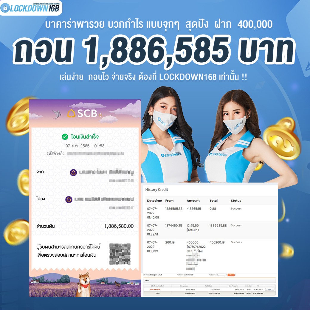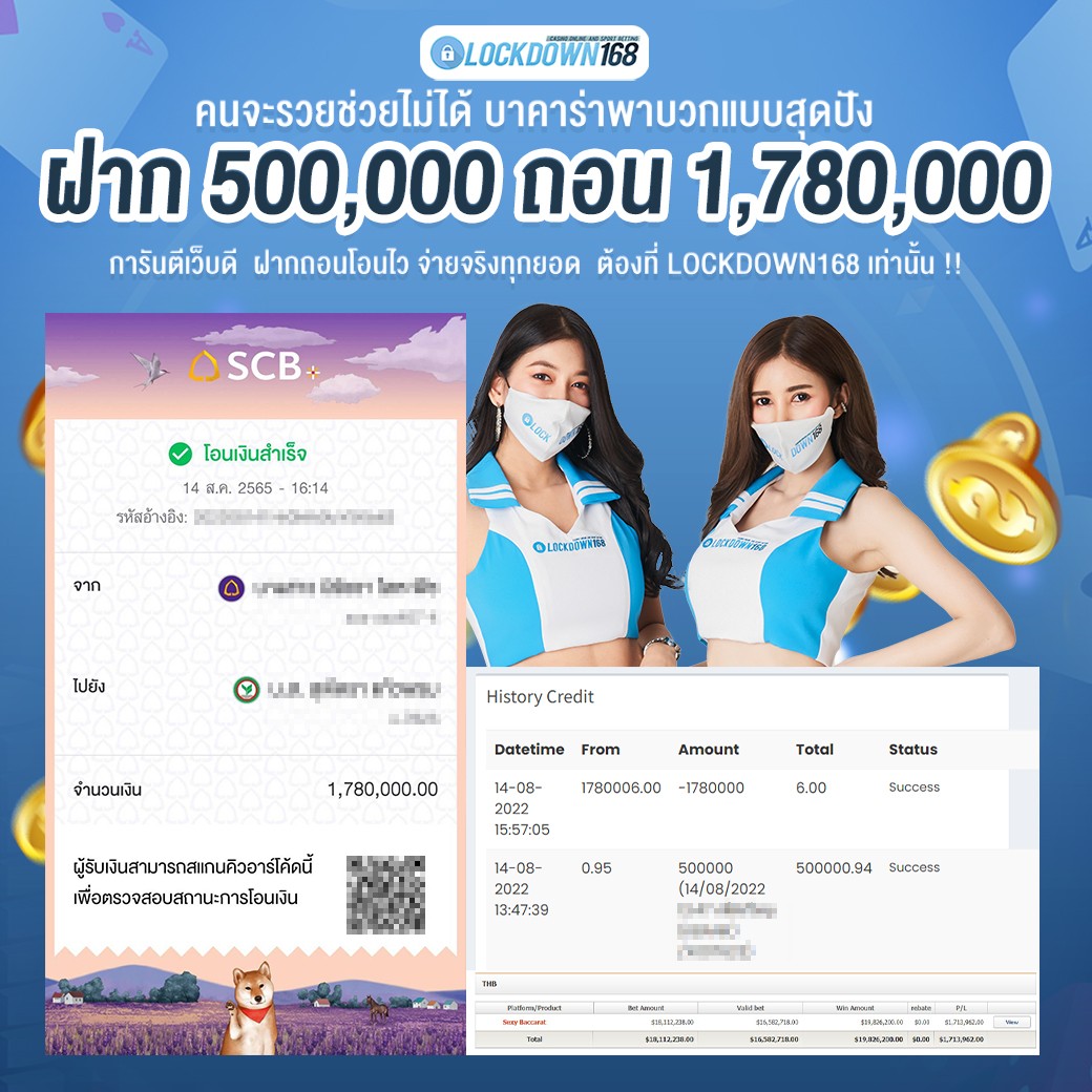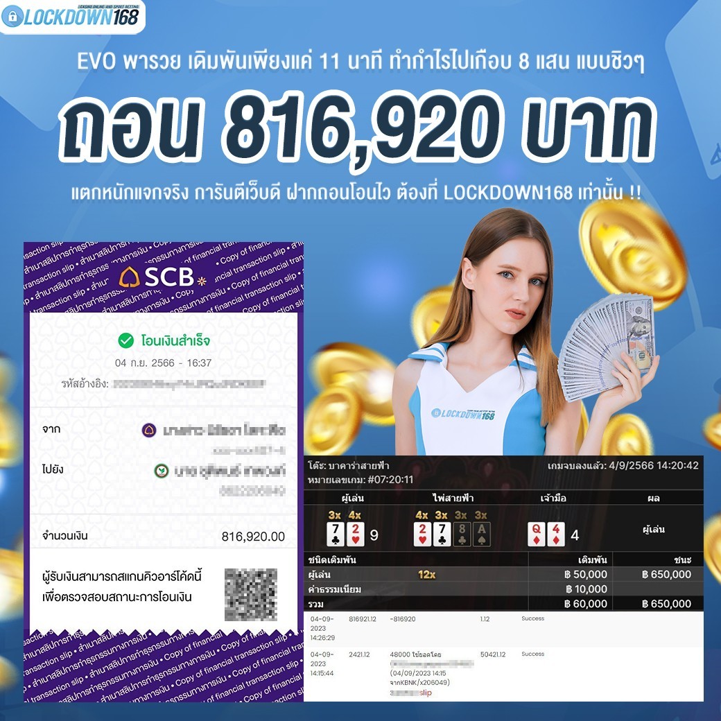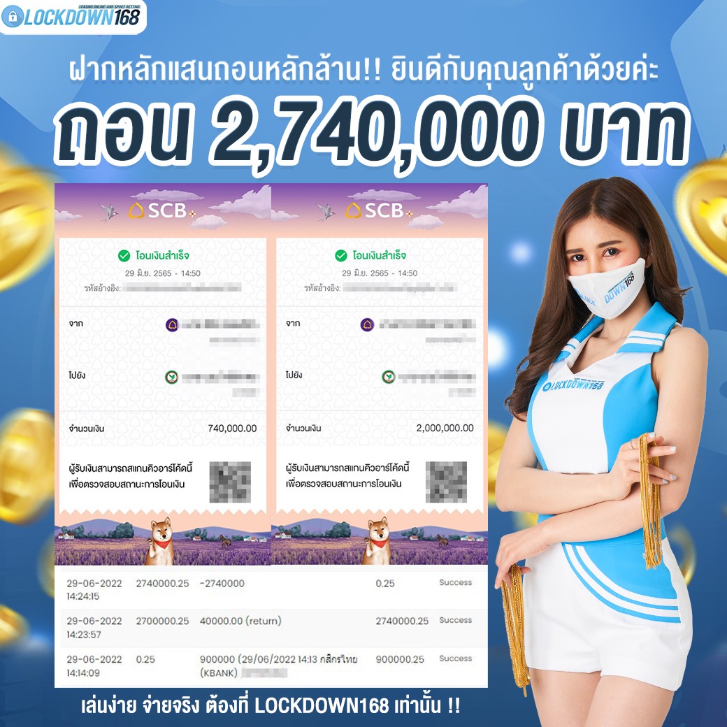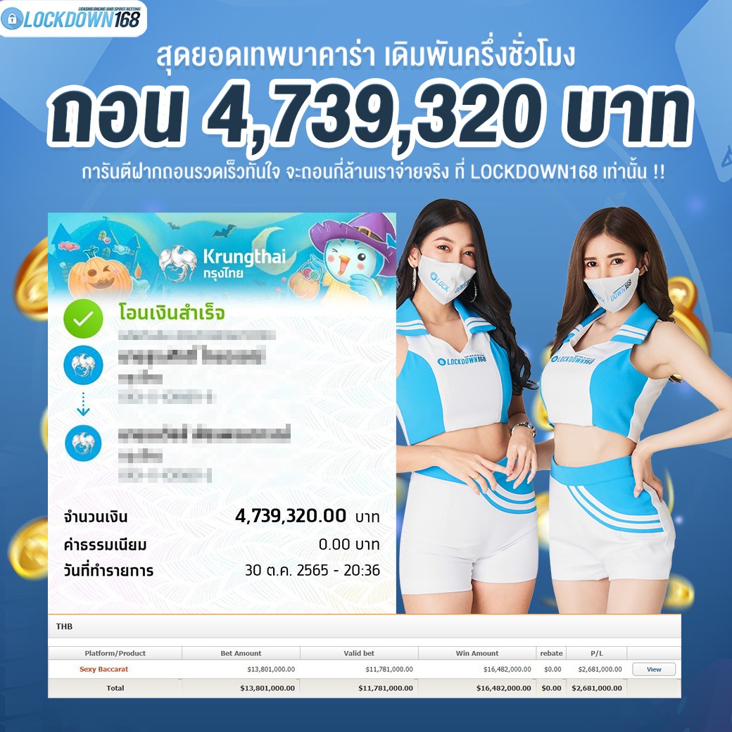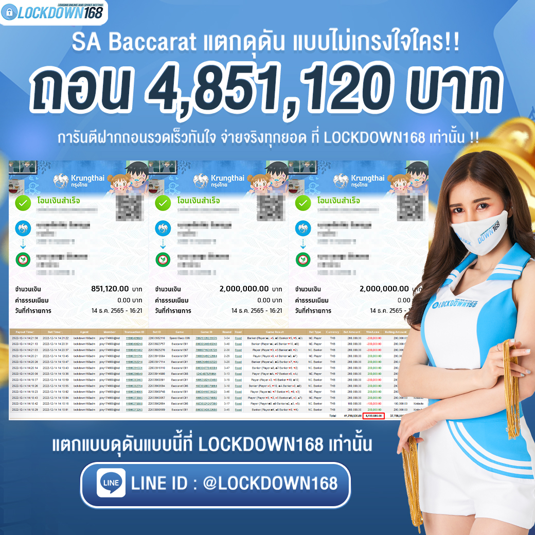 LOCKDOWN168.COM คาสิโนออนไลน์น้องใหม่ที่มาแรงที่สุดในตอนนี้ ด้วยระบบฝาก-ถอนอัตโนมัติ ที่ใช้เทคโนโลยีการจับยอดแบบใหม่ จับยอดฝากได้ภายใน 10 วินาที สามารถเล่นได้ทันทีหลังทำการโอนเงิน และระบบถอนเงินที่สามารถถอนเงินที่หน้าเว็ปได้ด้วยตัวท่านเอง โดยไม่ต้องแจ้งแอดมินและยอดเงินจะเข้าหลังจากทำการถอนภายใน 5 นาที เว็ปของเราคำนึงถึงความสะดวกสบายของลูกค้าเป็นหลัก หากลูกค้าพบปัญหาใดๆก็จะมีเจ้าหน้าที่แอดมินค่อยดูแลอำนวยความสะดวกให้คุณลูกค้าตลอด 24 ชั่วโมง